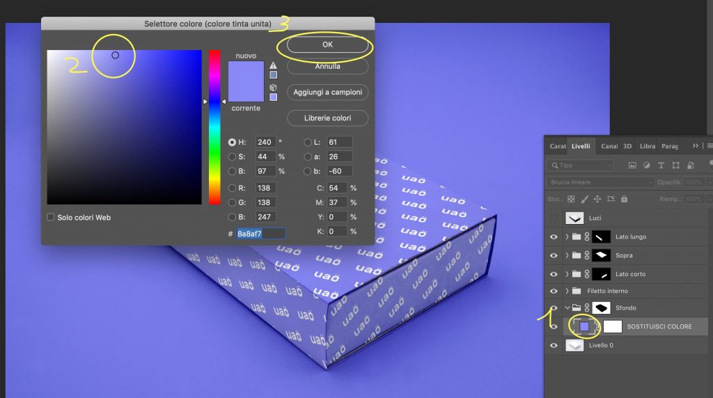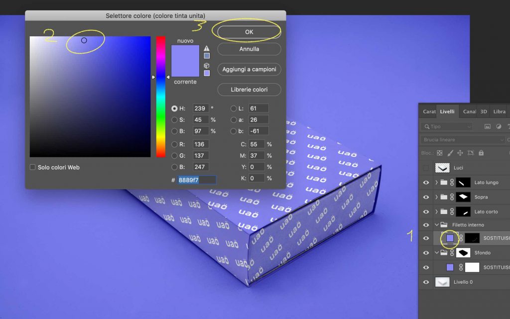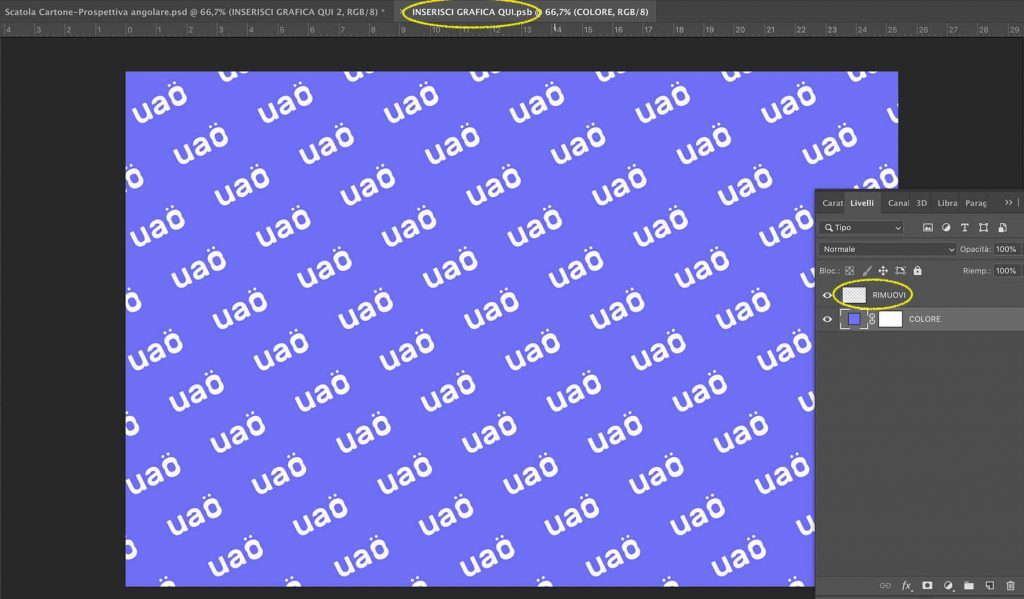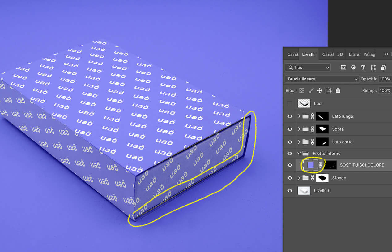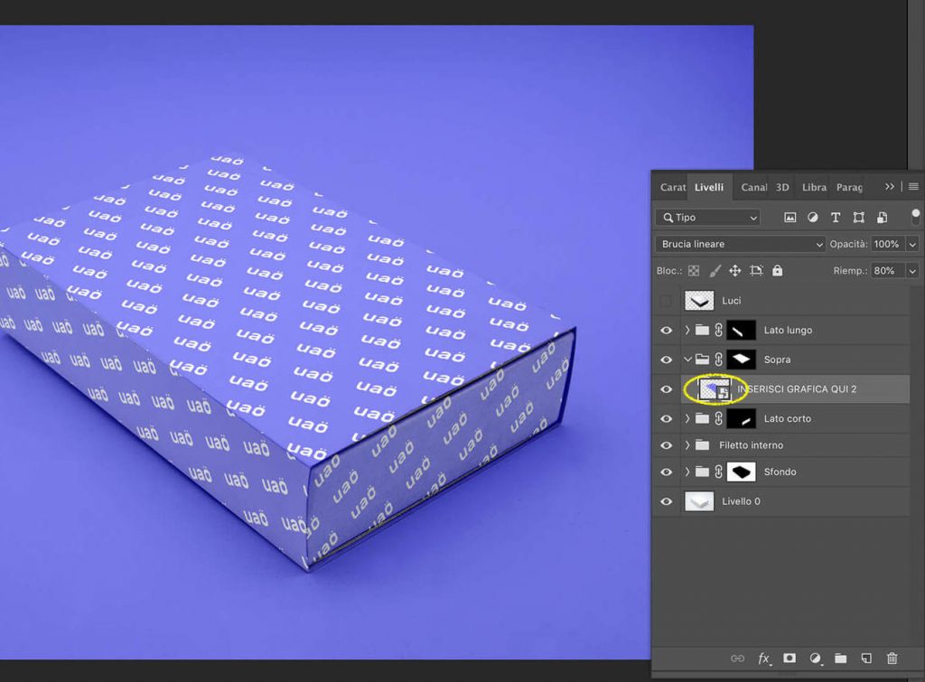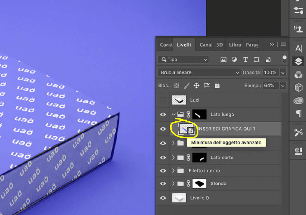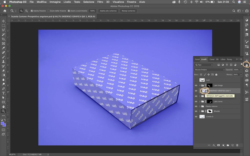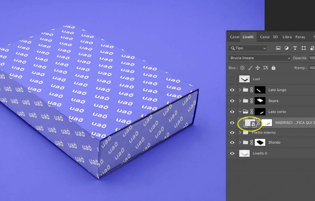 Per ottenere l’effetto UAO con il mockup della scatola rettangolare in prospettiva basta seguire il tutorial illustrato nei seguenti passaggi: